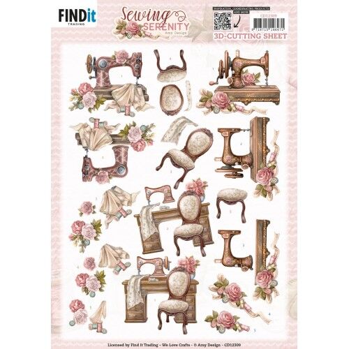 Knipvel met drie 3D-afbeeldingen in het thema van de collectie Sewing Serenity van Amy Design.