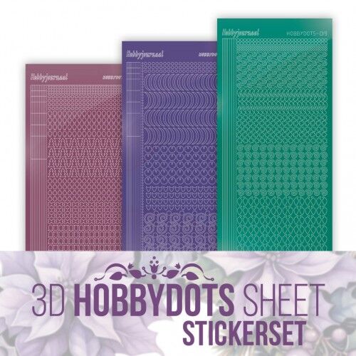 Deze handige Hobbydots-set bevat alle materialen voor 3 vierkante kaarten met elk een Hobbydotspatroon en een 3D-afbeelding. De set bevat 3 kleuren kaartkarton, drie Hobbydots-stickervellen en drie witte oplegkaarten met het voorbedrukte patroon. Door het voorbedrukte patroon zijn de kaarten te maken zonder lichtbak.